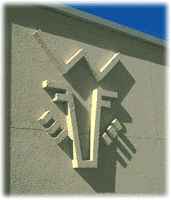 Large glyphs (coyote, elk, and cloud) on the building exterior, foam, fiber and stucco.