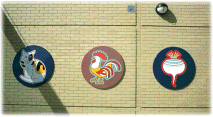 Eleven tondos, 36" porcelain enamel on steel; the site used to be Colorado's primary orphanage, a working farm: the images portrayed animals, children, and vegetables.