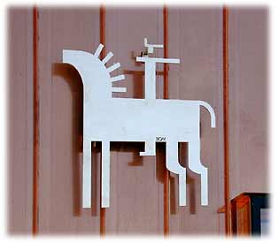 4'x4' aluminum pronghorn glyph on raised-seam copper siding. |