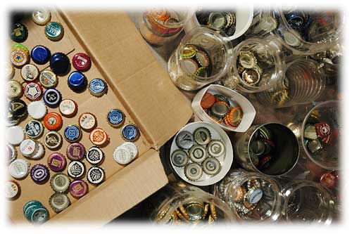 I have collected the caps for many years. I have sorted them out by color, keeping them in plastic bottles and jugs whose tops had been cut off. As I worked on making the medallions I continued sorting the caps, isolating batches of pure, matching caps.