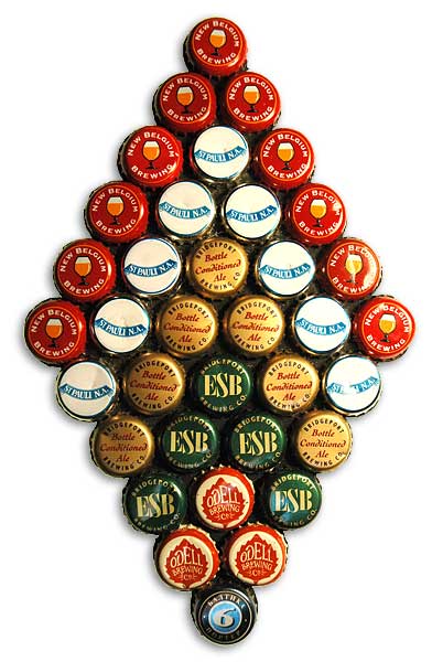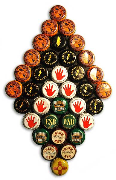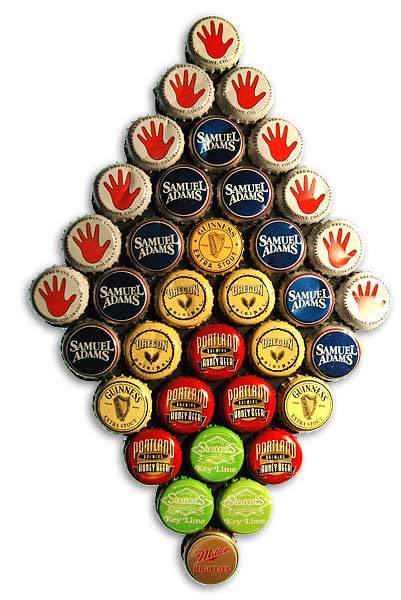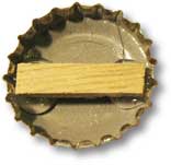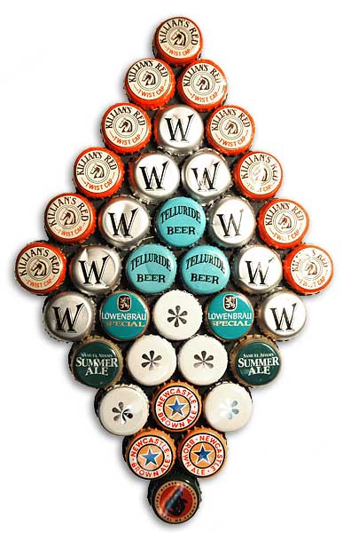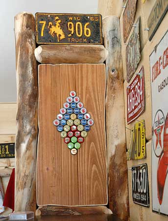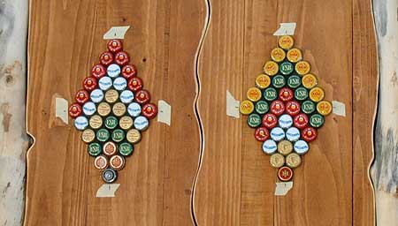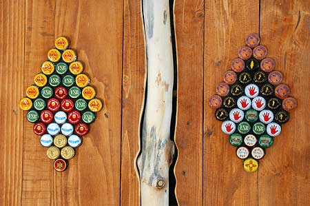 Applying the bottle caps proved to be a challenge. I did not want to nail them, the classic strategy of bottle-cap vernacular. I preferred to keep the top inviolate.