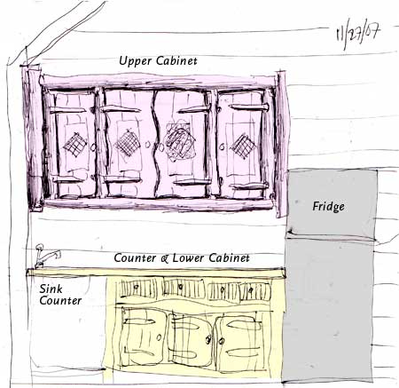 You can see the rough indication of diamond-shaped decoration on the upper cabinet doors. I had the idea to add bottle-cap medallions to the upper-cabinet doors.