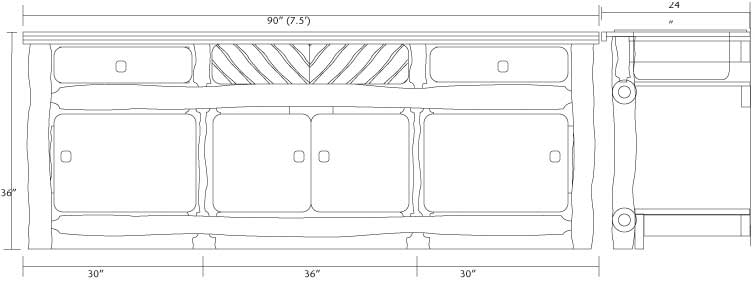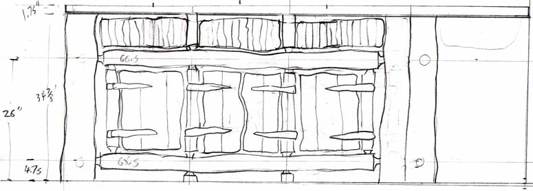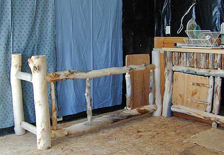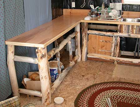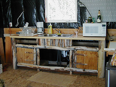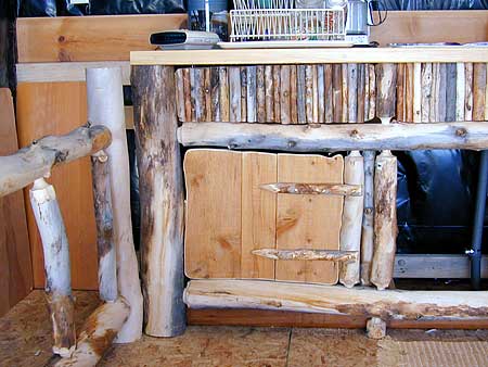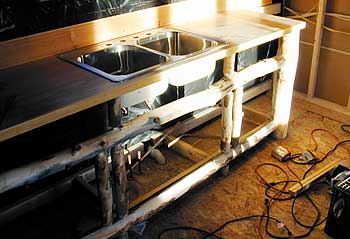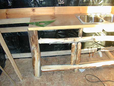 I made the counter top in the city and brought it up. It is 3/4" birch-veneer plywood with pine trim along the front. It has lots of varnish on it. I built the aspen structural facade using two 5" verticals at either end and two 3.5" horizontals. Thinner logs are made into balusters and also small verticals to separate spaces for drawers and a fascia board in front of the sink.