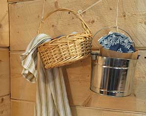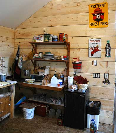 The shelf/desk unit has had many lives in our household. From the fall of '04 until March, '08 it was a vital part of the cabin kitchen. We also hung baskets and pails on the wall to provide additional storage.