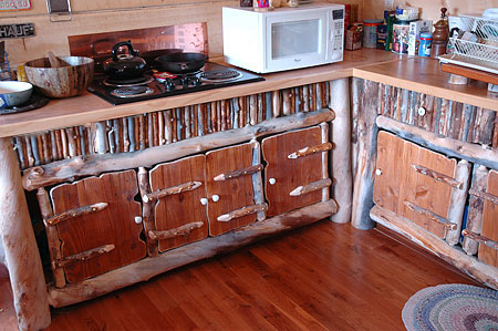 I made the cabinet doors in my city studio. I brought them up, made new pine-twig hinges, and then installed the doors. I also installed the bottle-cap medallions for the upper-cabinet doors. I had made them in the city.