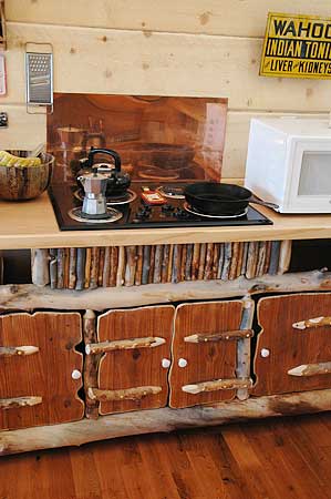 The top photo on this page shows that I was able to add a stove-top, some doors and some twig panels to the cabinets.