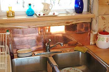 I was lucky enough to be visiting a sign supplier when he was cleaning up for a move. He offered me some very thick scrap copper. I glued it behind the stove top and the sink.