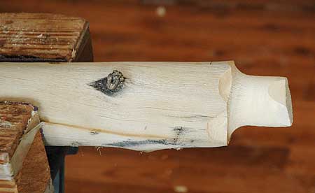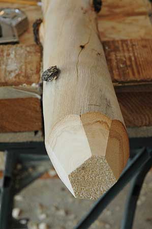 To make the tenon-cutter's work easier, I shape the end of the of the log using the bandsaw. I have to do this twice. After starting the tenon, I cut off more and then complete the tenon.