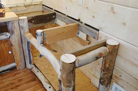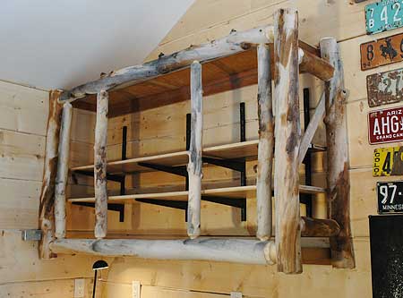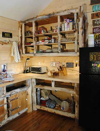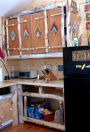 I made the cabinet doors in my city studio. I brought them up, made new pine-twig hinges, and then installed the doors. I also installed the bottle-cap medallions for the upper-cabinet doors. I had made them in the city.