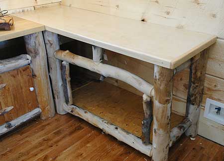 I prepared the counter top in the city. It has pine and cedar trim on its edges. It is fastened using metal hardware.