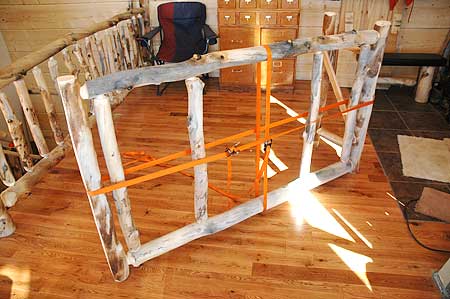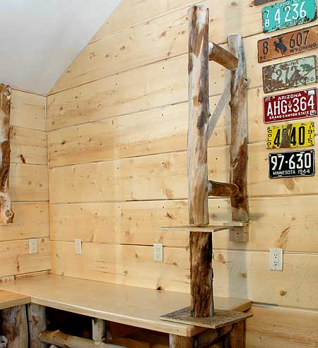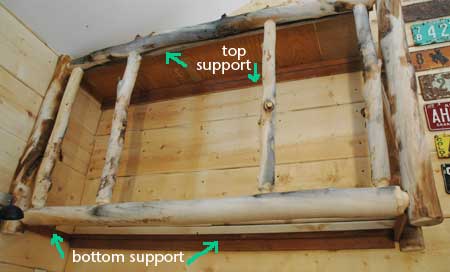 The wall planks in the cabin are held up by pneumatically-driven nails. I added lots of 3" screws though the planks into studs, to reinforce the adhesion of the planks to the walls. Then I screwed the suport logs into the planks, using a number of large-diameter screws.