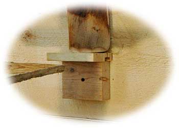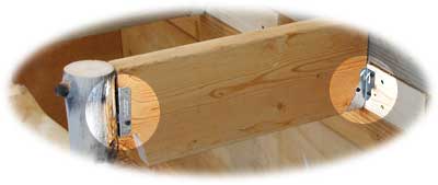 These horizontal supports are made of 2x6 fragments. They are held in place by Simpson Strongtie products which I buy at my local Home Depot. They come in a variety of styles. They are especially useful for the improvisational cabinet maker, allowing you to create strong construction without perfect carpentry. Log framework is very flexible and changes its geometry during installation; the Strong-ties accomodate this imprecision.