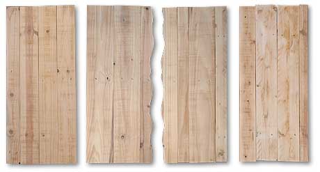 The doors are made of wood from paper palettes recycled from a printer's factory: large sheets of paper are shipped on fork-lift palettes; a cover of thin boards is placed on top. I reassembled the cover boards for my cabinet doors. They have two horizontal boards, also taken from the cover, on the backside. I bolted the hinges through these horizontals.
