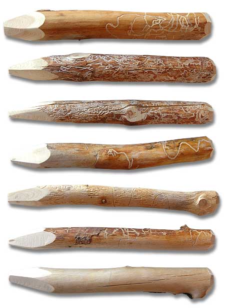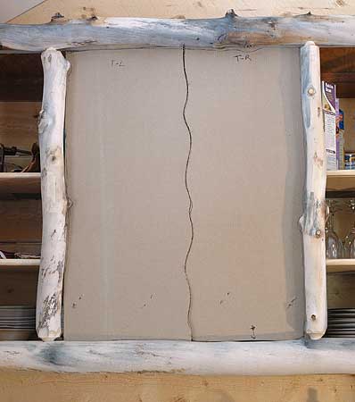 I had a good supply pine branches saved up. But one week before I made these hinges, I happened to find a bunch of short twigs that had wonderful color and beetle-carved surfaces. All the hinges for these cabinets came from that gathering. |