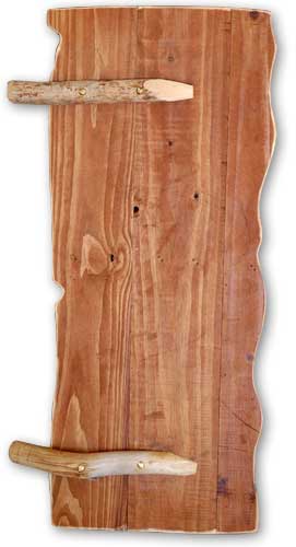 The hinges are made from pine branches gathered while hiking. They have complex patterns carved in by beetles. The backside is cut flat with the bandsaw. I shape the ends with the bandsaw and sand them.