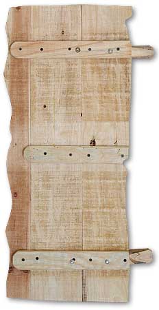 I also make adjustments to the edges of the outer two doors; they must accomodate what happens when the central doors swing out, bringing their twig hinges into the outer doors' edges. |