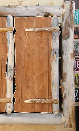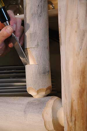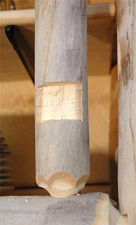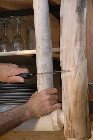 First I note the rotational position of the hinge-balusters. When I made the log frames and balusters, I placed tape on the chosen front side of the balusters, choosing and marking the plane of the closed door.