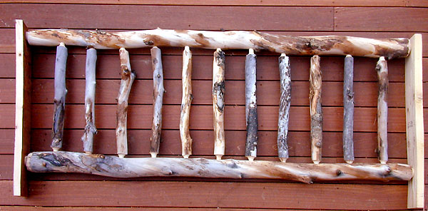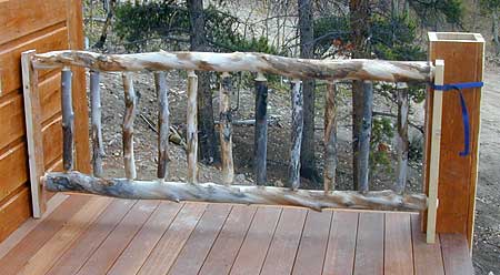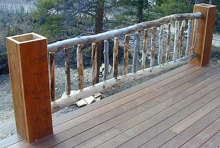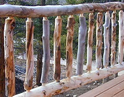 Early in the design and planning process, I took on the task of building the railings, using standing dead aspen trees. In the cabin's neighborhood, the dead trees have a wonderful variety of colors. Dead aspens are usually a silver-gray color. But have I found many that were much lighter, varying from a shiny bone color, to oranges and bowns, "painted" naturally in patches and spiraling streaks.