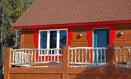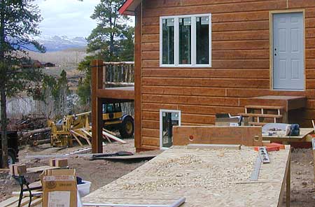 The cabin's milled-fir planks are coated with a brown version of UV Guard. I used a clear version on the sofits, and on the deck's mahogany boards. I used the clear UV Guard to refresh the fir extereior planks, which take a beating in our high-altitude sun.