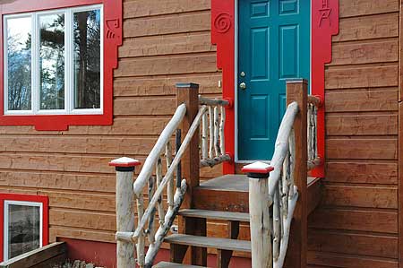 The builder had built the landing, its squared verticals, and the stairs. I set vertical aspens in concrete. Orginally their painted caps had small wooden spheres on the red squares. This design was flawed: moisture collected on the spheres and flowed down to where they joined the red squares. The spheres rotted. So I replaced them with roof-shaped white caps. They seem more stable, though I miss the spheres.