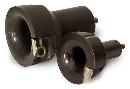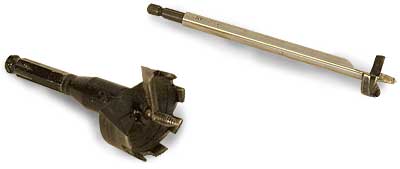 These are the two tenon cutters I used. One makes a 2" tenon; the other makes a 1" tenon. They are a Veritas product from Lee Valley tools. They install in a 1/2" drill. When applied to the end of a log the stainless blade cuts off spirals of wood until you have a tenon of the appropriate size and length.