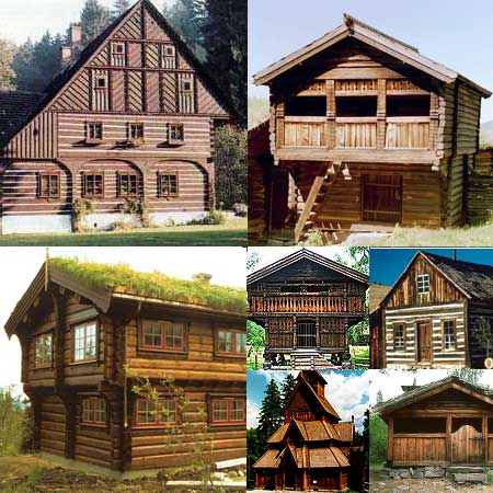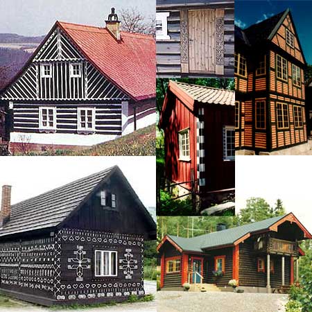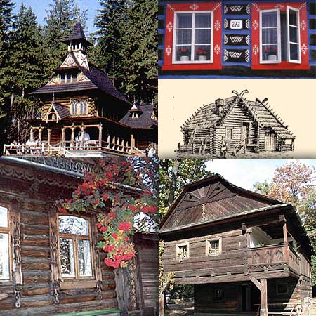 When I began to design the finish of the cabin in the spring of 2004, I researched vernacular architecture. The cabins and wooden buildings of eastern Europe, Russia, and Scandinavia offered many examples of exuberant sculptural expression. This page shows some of the images I cobbled together before making my photoshop elevations of our cabin.
