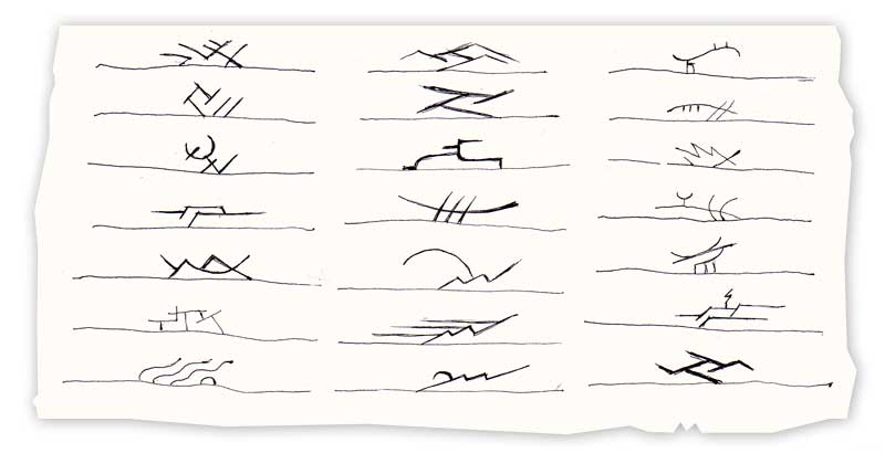 From the sketches I plan to refine some new, wider glyphs to go over the cabin's three triple-windows.