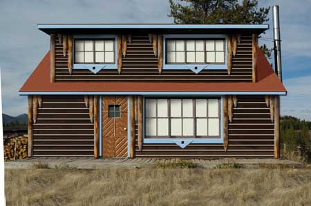 I proposed to add pine timbers with the bark removed to the corners of the cabin. The pediment would be filled with a stucco, and sliced pine-logs would be layered at ninety degrees to the roof plane. Red fascia boards and window trim would be joined by a red door.