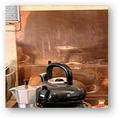 Copper: splash guards for the stove top and the sink. This thick copper was given to me by a friend who was moving his business.