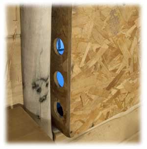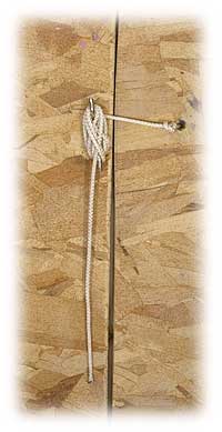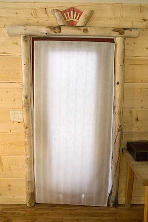 The curtain's top (on the left in the above shot of the curtain's inside) is a rigid scrap of roofing-vent plastic. It has a series of holes, which allow hot air to rise out of the curtain. The bottom of the curtain, on the right, has my standard three-hole airflow vents. Mylar valves stop the cold air flow at night. The whole apparatus hangs on small brackets on the top of the door. The brackets are made of paper clips.