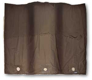 The curtains are made of silver bubble insulation. The outer surface is covered with black cloth I found in a dumpster after Halloween. It had raggedy-cut edges and appeared to have been decoration for a party. On some of the curtains I later added cloth on the inside, just to make them look better. (I often leave the curtains up the night we arrive.)