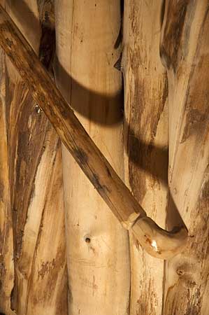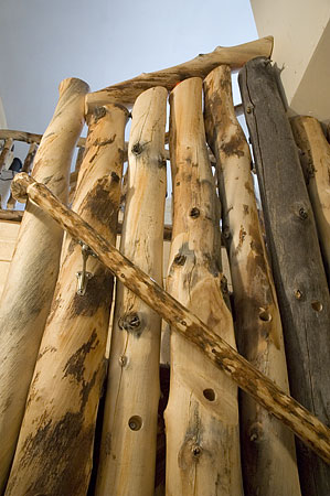 The hand railing is made of pine, which is much stronger and straighter than aspen. It needs to be small in diameter. Again, the trees I harvested were standing dead timber, already cured. Unlike the aspens, they were cover with bark. I used my bandsaw to remove much of the bark. Belt-sanding smoothed the exposed wood and remaining bark. I varnished the railings because of the their constant contact with hands.