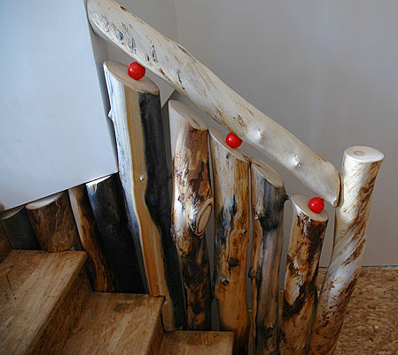 Here you can see the trees right after installation. I sanded and varnished the angle-cut tops of the trees. I wanted them to be visible and and easy to touch, so I added the red spheres to force a large gap betwee the verticals and the angled log.