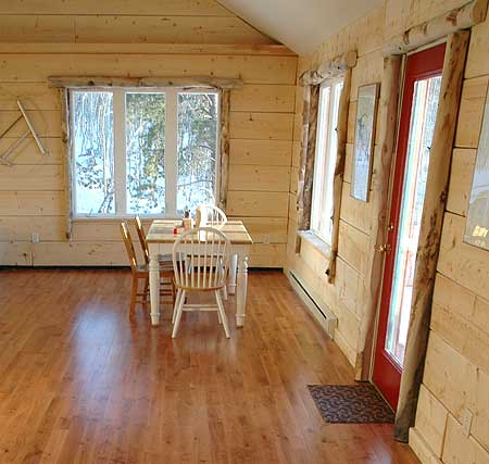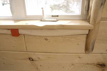 Beneath the sills are planks of aspen, cut on three sides. The lower edge is the natural exterior of the log. The boards are then varnished.