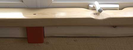 Between each of the three sub-sill trim boards are blocks of aspen which have been painted red.