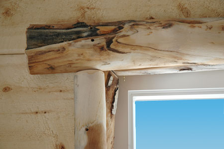 Choosing and placing the logs requires lots of decisions. Flaws in an otherwise smooth, bone-colored log can become satisfying detail when isolated by the cut of the lintel.