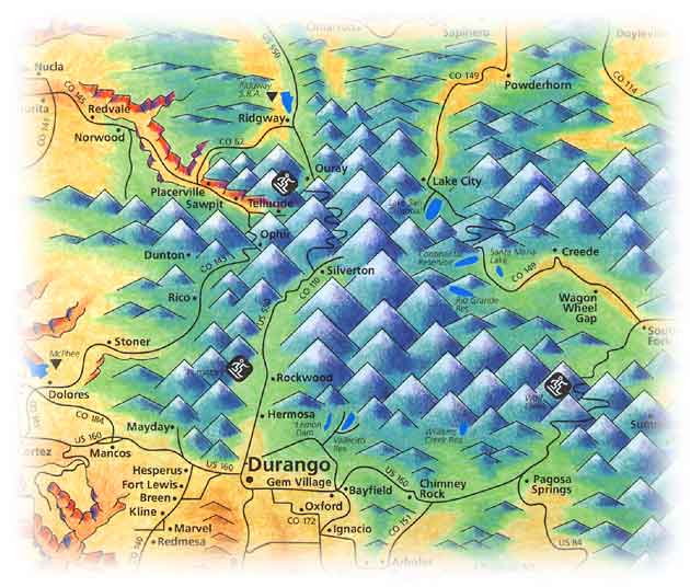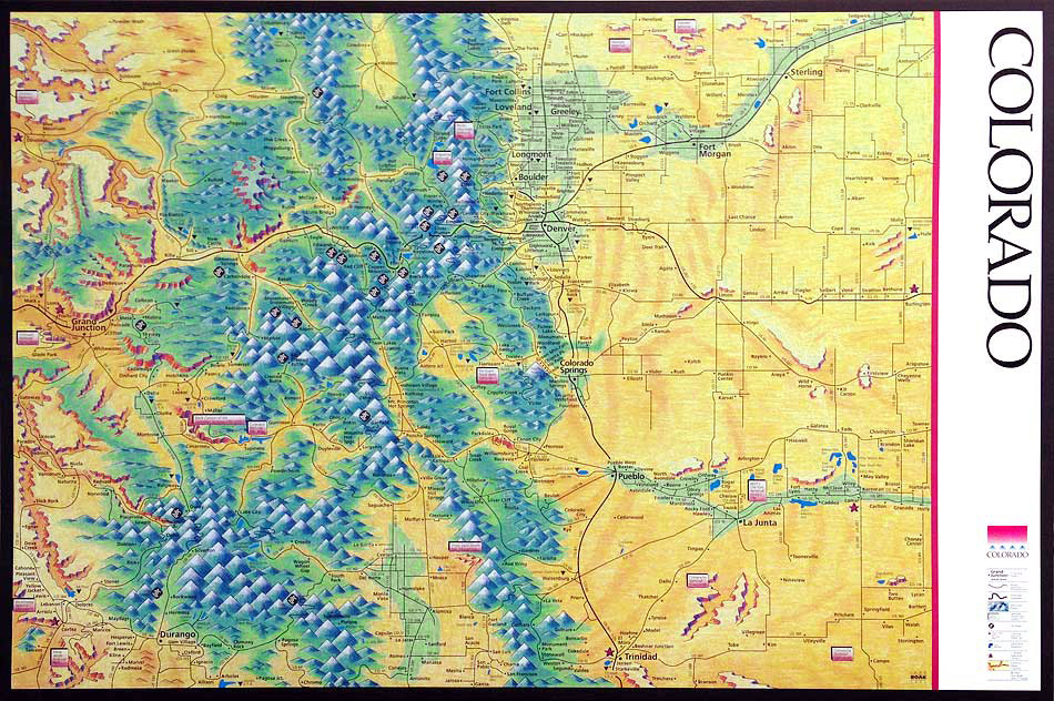 This poster measures 18"x27". It features a unique illustration of Colorado's varied landforms, as well as all paved roads, National Parks and Monuments, State Recreation Areas, and ski areas. $12.00 |
