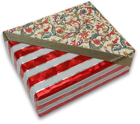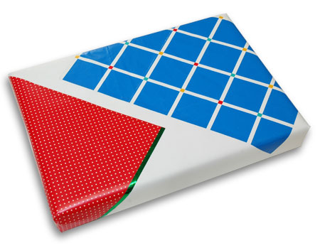 This wrap uses two pieces of typical wrapping paper. These fragments often have damaged parts. When you cut them away you are left with odd-shaped pieces. The fearless wrapper applies the striped piece first, then adds a second piece along the angled edge of the stripes.
