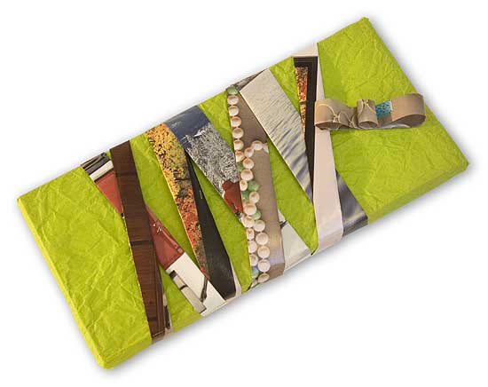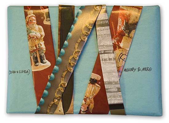 This band collage uses wrinkled tissue in a strong color for the under wrap. It also leaves more open area, so the bands are more like ribbon. A simple "bow" of image paper has been added.