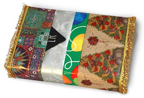 The underwrap is wrinkled metallic tissue. The bands are all made of wrapping-paper scraps.