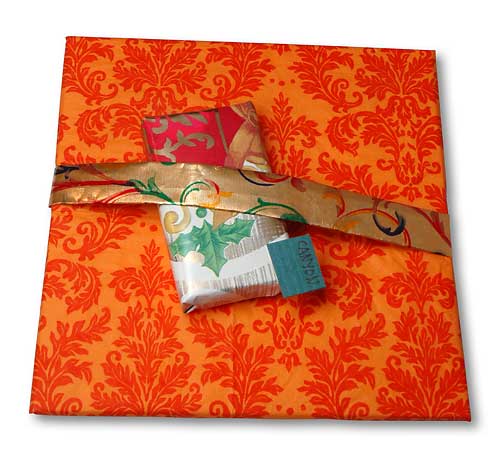 The gift is small and it is wrapped with two tiny fragments of recycled wrapping paper. But I wanted something more. I took a square of foam-core board and wrapped it with a bright paper napkin that had been lurking for many years in my paper drawer. I took a spare band of folded foil paper and use it to fix the little box in place. The name tag is glued on, overhanging the corner, to add an extra bit dimensionality to the wrap.