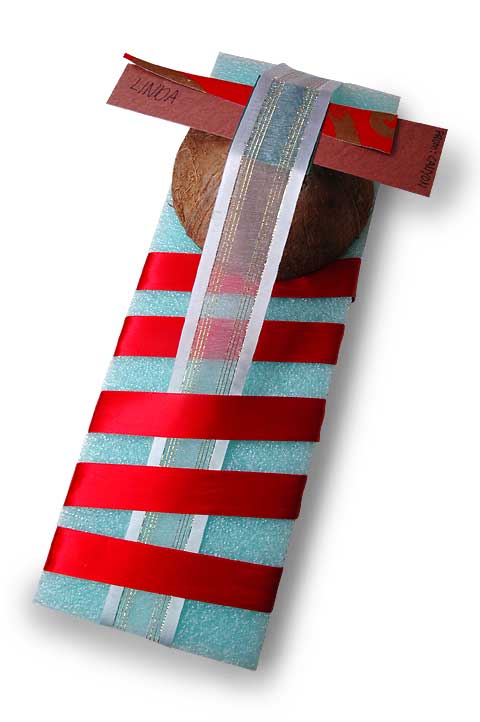 I took a second ribbon fragment, transparent and metallic, and taped it to the back of the foam. I wove it under the first three bands of red ribbon then let it soar up to the pinnacle of the coconut and plunge back down to the back of the blue foam.