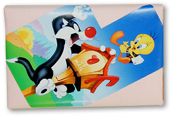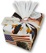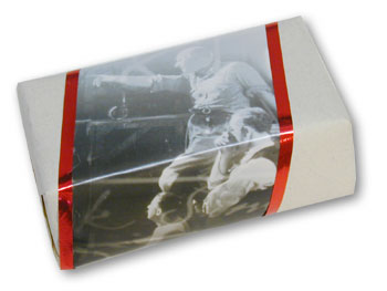 Commemorative postage stamps often have large images alongside the stamps. This one came from stamps honoring Hollywood and film making. The image is of producer Otto Preminger on a set. The recipient of this gift is a video producer. Red foil ribbons complete the job.