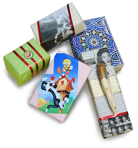The wrap artist can, in this instance of multiple wrappings for one gift, permit the wrapping of small packages in a single piece of paper. This one was a piece of direct mail.