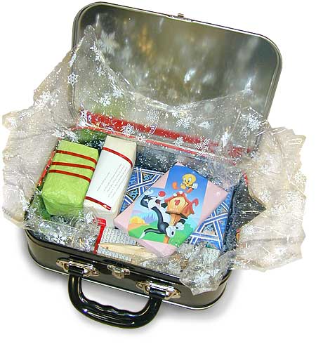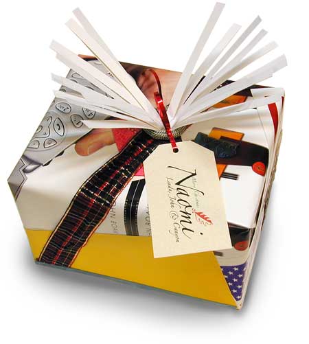 Sometimes you want to put a little more into the project, using your wrap art skills to make a splash. This gift was a constellation of little gifts. I bought a fancy lunch box to hold them. Then I wrapped each present, fit them in the lunch box and wrapped it too.