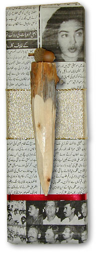 This is a study in contrasts. The base wrap is a Pakistani newspaper pick up in a cab ride. Gold and red ribbon bring that vital extra element of complexity. On top I have glued on a carved twig and an acorn. The twig has two contrasting surfaces itself: a russet and gray natural surface and the fresh bright wood revealed by the carving. Altogether, the subtle contrasts between all the materials add up to a delicious whole, with a unique feel.