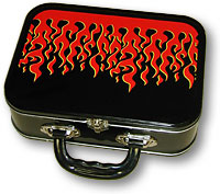 The inner wrap is a gift itself, a flaming lunch box, containing a group of five wrapped presents. A piece of festive, clear wrap surrounds the team of gifts