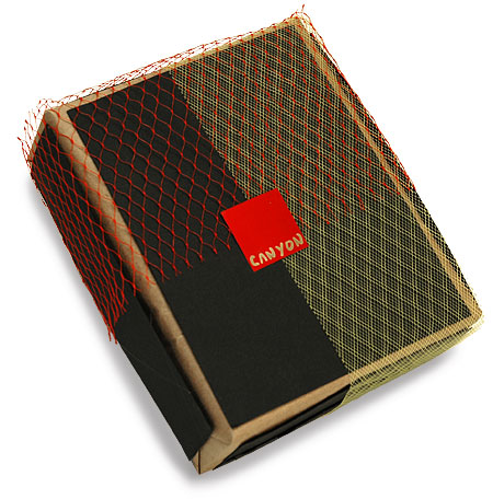 The wrap continues the theme of offset rectangles. A black rectangle is place off-center on a glossy shopping-bag wrap. The square label is place off-center on the black rectangle.