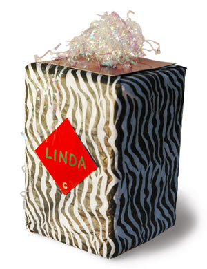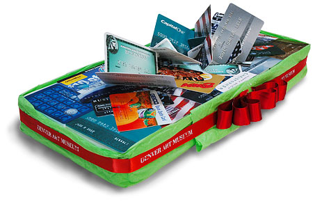 This wrap is a creative excursion. I wanted to see what I could do with all those fake cards that come in the mail. They are glued flat at first. Then I cut them and made an angular sculptural "bow" of cards. The outer edge of the gift is a tissue frame, with a red ribbon. The red bow is made by layering ribbon back and forth, adding a spot of glue on each pass.
