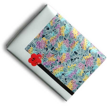This season I used a packet of Japanese paper, small squares of exqusitie paper. I wrapped the gift in white paper. I attached one square off center. I added a strip of black paper as an accent, then used one of the label flowers that came with the Japanese paper.